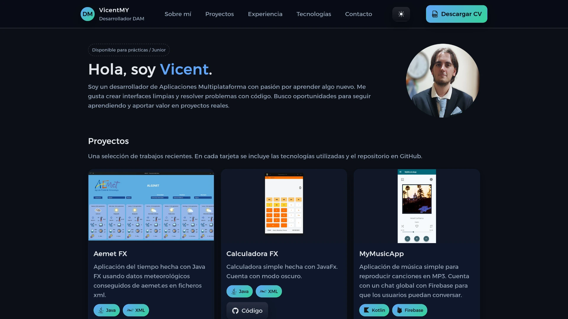 Soy un desarrollador de Aplicaciones Multiplataforma con pasión por aprender algo nuevo. Me gusta crear interfaces limpias y resolver problemas con código. Busco oportunidades para seguir aprendiendo y aportar valor en proyectos reales.